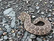 The color pattern varies geographically. The head has two well-marked dark bands - one on the crown and the other between the eyes. On the sides of the head, two oblique, dark bands or bars run from the eye to the supralabials. Below, the head is yellowish white with scattered dark blotches. Iris color ranges from gold to silver-gray. Dorsally, the ground color varies from straw yellow, to light brown, to orange or reddish brown. This is overlaid with a pattern of 18–22 backwardly directed, dark brown to black bands that extend down the back and tail. Usually, these bands are roughly chevron-shaped, but may be more U-shaped in some areas. They also form two to six light-and-dark cross-bands on the tail. Some populations are heavily flecked with brown and black, often obscuring other coloration, giving the animal a dusty-brown or blackish appearance. The belly is yellow or white, with a few scattered dark spots. Newborn young have golden head markings with pinkish to reddish ventral plates toward the lateral edges.[4][8]