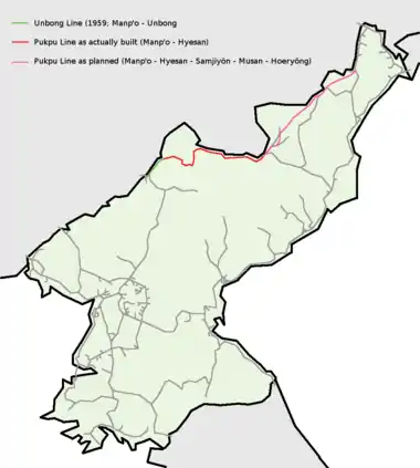 | Opened | Unbong Line (Manp'o–Unbong): 1959 Unbong–Hyesan: 1987-1988 | ||||||||||||||||||||||||||||||||||||||||||||||||||||||||||||||||||||||||||||||||||||||||||||||||||||||||||||||||||||||||||||||||||||||||||||||||||||||||||||||||||||||||||||||||||||||||||||||||||||||||||||||||||||||||||||||||||||||||||||||||||||||||||||||||||||||||||||||||||||||||||||||||||||||||||||||||||||||||||||||||||||||||||||||||||||||||||||||||||||||||||||||||||||||||||||||||||||||||||||||||||||||||||||||||||||||||||||||||||||||||||||||||||||||||||||||||||||||||||||||||||||||||||||||||||||||||||||||||||||||||||||||||||||||||||||||||||||||||||||||||||||||||||||||||||||||||||||||||||||||||||||||||||||||||||||||||||||||||||||||||||||||||||||||||||||||||||||||||||||||||||||||||||||||||||||||||||||||||||||||||||||||||||||||||||||||||||||||||||||||||||||||||||||||||||||||||||||||||||||||||||||||||||||||||||||||||||||||||||||||||||||||||||||||||||||||||||||||||||||||||||||||||||||||||||||||||||||||||||||||||||||||||||||||||||||||||||||||||||||||||||||||||||||||||||||||||||||||||||||||