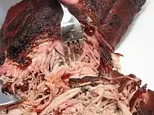 Pulled pork is an American barbecue dish, more specifically a dish of the Southern U.S., based on shredded barbecued pork shoulder. It is typically slow-smoked over wood (usually outdoors); indoor variations use a slow cooker. The meat is then shredded manually and mixed with a sauce. It may be served on bread or eaten on its own. In combination with spare ribs and brisket it is considered a part of the holy trinity of barbecue.