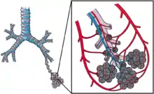 Alveoli are first located in the respiratory bronchioles that mark the beginning of the respiratory zone. They are located sparsely in these bronchioles, line the walls of the alveolar ducts, and are more numerous in the blind-ended alveolar sacs.[4] The acini are the basic units of respiration, with gas exchange taking place in all the alveoli present.[5] The alveolar membrane is the gas exchange surface, surrounded by a network of capillaries. Across the membrane oxygen is diffused into the capillaries and carbon dioxide released from the capillaries into the alveoli to be breathed out.[6][7]