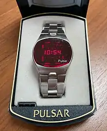 In 1970, Pulsar was a brand of the American Hamilton Watch Company which first announced that it was making and bringing the LED watch to market. It was developed jointly by American companies Hamilton and Electro/Data Inc. In spring 1972,[1][2] the first Pulsar watch was marketed by Hamilton Watch (the parent company, not the Hamilton Watch Division). With an 18-carat gold case, the world's first all-electronic digital watch was also the first to use a digital display created with light-emitting diodes (LEDs).[3] A button was pressed to display the time. The first Pulsar initially sold for $2,100 ($14,100 in 2021 dollars). In October 1972, the Potpourri segment in the issue of Playboy mentioned the first Pulsar, and included a photo. In 1975, a digital Pulsar with a built-in calculator was released.[4] In 1978, Seiko Corporation acquired the Pulsar brand, it is mid-grade of their product range. In March 2020, Seiko stopped distribution of Pulsar in the United Kingdom.