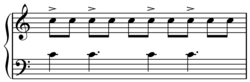 The pulse may be audible or implied. The tempo of the piece is the speed of the pulse. If a pulse becomes too fast it would become a drone; one that is too slow would be perceived as unconnected sounds.[3] When the period of any continuous beat is faster than 8–10 per second or slower than 1 per 1.5–2 seconds, it cannot be perceived as such.[3] "Musical" pulses are generally specified in the range 40 to 240 beats per minute. The pulse is not necessarily the fastest or the slowest component of the rhythm but the one that is perceived as basic. This is currently most often designated as a crotchet or quarter note when written (see time signature).