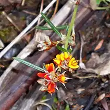 Pultenaea parrisiae, commonly known as bantam bush-pea,[2] or Parris's bush-pea,[3] is a species of flowering plant in the family Fabaceae and is endemic to south eastern continental Australia. It is a low-lying sub-shrub with linear to lance-shaped leaves with the narrower end towards the base, and yellow to purple flowers with red markings.