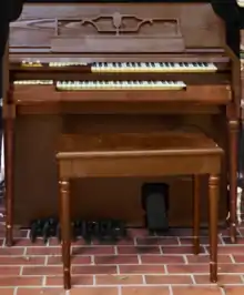 The pump organ is a type of free-reed organ that generates sound as air flows past a vibrating piece of thin metal in a frame. The piece of metal is called a reed. Specific types of pump organ include the reed organ, harmonium, and melodeon. The idea for the free reed was imported from China through Russia after 1750, and the first Western free-reed instrument was made in 1780 in Denmark.[1][2]