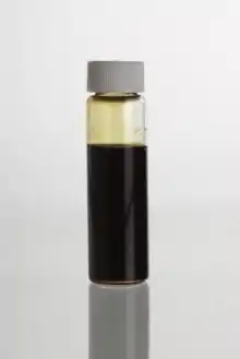 The viscous oil is light to very dark green to dark red in colour depending on the thickness of the observed sample. The oil appears green in thin layers and red in thick layers, an optical phenomenon called dichromatism.[6] Pumpkin oil is one of the substances with the strongest dichromatism. Its Kreft's dichromaticity index is -44.[7] When used together with yoghurt, the oil turns bright green and is sometimes referred to as "green-gold".