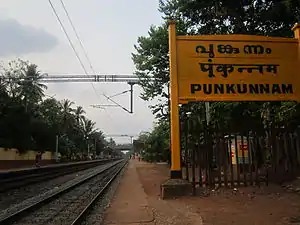 Punkunnam railway station (Station Code: PNQ) falls between Thrissur railway station and Mulankunnathukavu railway station in the busy Shoranur–Cochin Harbour section. Punkunnam railway station is operated by the Chennai-headquartered Southern Railways of the Indian Railways. The station is used as suburb station of Thrissur railway station. The station act as Junction where separate branch line goes to Guruvayur railway station which is near to the famous Guruvayur Temple. All passenger trains and a few long-distance express trains stop at Punkunnam railway station.[1][2][3]