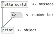 Pd supports four basic types of text entities: messages, objects, atoms, and comments. Atoms are the most basic unit of data in Pd, and they consist of either a float, a symbol, or a pointer to a data structure (in Pd, all numbers are stored as 32-bit floats). Messages are composed of one or more atoms and provide instructions to objects. A special type of message with null content called a bang is used to initiate events and push data into flow, much like pushing a button.
