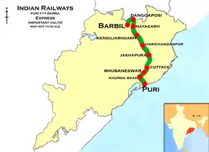The 18416 / 15 Puri–Barbil Express runs from Puri via Khurda Road Junction, Cuttack Junction, Dangoaposi to Barbil.