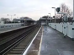 Purley Oaks railway station is in the London Borough of Croydon in south London, on the Brighton Main Line 12 miles 34 chains (20.0 km) measured from London Bridge.[2] All trains serving it are operated by Southern and it is in London Travelcard Zone 6. The station has four platforms: a disused side platform on the up fast line, an island platform with a disused face on the down fast line and an eastern face used by up trains, and a side platform on the eastern side used by down trains. The two platforms are only used during engineering works. There is also a pay-and-display car park at the station.