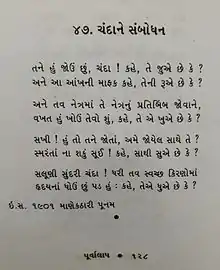 Purvalap (Gujarati: પૂર્વાલાપ) is a posthumously published collection of poems by Manishankar Ratnji Bhatt alias Kavi Kant, in 1923.[1] Kant has invented a new form of Khandkavya by blending the Greek and Sanskrit concepts of tragedy. Kant has given many literary significant poems by this work such as Vasant vijay, Chakravakmithun, Devyani and Sagar Ane Shashi.[2]