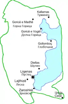 The village of Cerje was first mentioned in documents from 14th century. The names of other villages were found in more modern documents. According to a 1900 ethnographic survey, the numbers of inhabitants at the time was 1,830.[6] The "La Macédoine et sa Population Chrétienne" survey by Dimitar Mishev (D. Brankov) from 1905 shows that the local Christian inhabitants were divided between Bulgarian Exarchate and Patriarchate of Constantinople.[7] On 18 March 2013, the Albanian government changed the official name of the municipality, from the Albanian Liqenas to the Macedonian Pustec.[8]