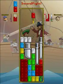 - Sword fighting is similar to Super Puzzle Fighter. Puzzle pieces consisting of two blocks, each of one of four colors, fall into a well The only exception is if you go on a SMH (sea monster hunt) then an extra color and breaker for that color drops. "Breaker" pieces, of the same color and depicting the same sword as the normal pieces, destroy all groups of similar pieces which they touch. Arranging pieces and destroying them sends pieces to the opponent, in the form of silver swords and blocks that eventually turn into normal blocks. The last player (or team of players) whose well entrance has not been blocked up wins. Brawling simply refers to teamed sword fighting duels, where two groups of 2 or more pirates puzzle against one another in a scenario similar to the sword fighting that occurs at the end of a sea battle. Players may also purchase swords for use in sword fighting. Each sword sends a different pattern of pieces to opponents. While more expensive swords tend to be more powerful, each one has both strengths and weaknesses. Swords include cleavers, stilettos, scimitars, falchions and others. All new players start the game with a foil, the cheapest type of sword. But you may buy a sword with two different colors of enamel, the different colors affect the colors that drop when you send blocks to your opponent.