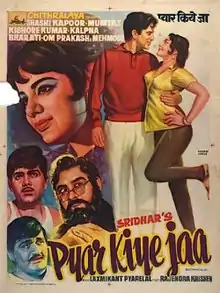 Pyar Kiye Jaa (transl. Carry on Loving) is a 1966 Indian Hindi-language romantic comedy film directed by C. V. Sridhar starring Kishore Kumar, Shashi Kapoor, Mehmood, Om Prakash, Mumtaz, Kalpana and Rajasree. It was a "semi-hit" at the box office.[2] The film is a remake of the Tamil comedy Kadhalikka Neramillai (1964), which was remade into Telugu as Preminchi Choodu in 1965. Actress Rajasree starred in all three versions of the film.[3] Kadhalikka Neramillai was also later remade in Kannada as Preethi Madu Thamashe Nodu and in Marathi as Dhoom Dhadaka.[4] The role played by Nagesh in the Tamil version was reprised by Mehmood in the Hindi version and by Dwarakish in the Kannada version.