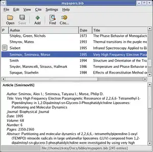 Pybliographer is a reference management software tool that deals with bibliographic databases, used for viewing, editing, searching, and reformatting bibliographies. Written in Python and licensed under GNU GPL, it provides a scripting framework of classes and functions, which makes it extendable to many other applications. Documentation is available.[3][4][5]