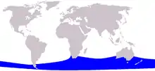 The pygmy right whale is among the least studied cetaceans; until 2008, fewer than 25 sightings of the species had been made at sea.[6] The species lives in the Southern Hemisphere and is believed to be circumpolar, living in a band from about 30°S to 55°S[3] in areas with surface water temperatures between 5 and 20 °C (41 and 68 °F).[18] Individuals have been found on the coasts of Chile,[22] Tierra del Fuego, Namibia, South Africa, Australia and New Zealand. One group may be a year-round resident off Tasmania.[18] The total population is unknown.