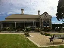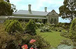 It is built of granite and has nine bedrooms and outbuildings.[1] The projecting wings have distinctive curvilinear parapeted gable and bay windows. The roof is made from hipped corrugated iron and topped with rendered brick decorative chimneys. Enclosed in a verandah the building is set on 3,400 square metres (0.840 acres) of low manicured gardens. Pyrmont is based on the South African Cape Dutch Colonial architectural design.[2]