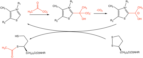 The thiamine pyrophosphate (TPP) converts to an ylide by deprotonation. The ylide attack the ketone group of pyruvate. The resulting adduct decarboxylates. The resulting 1,3-dipole reductively acetylates lipoamide-E2.[2]