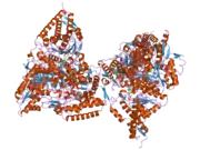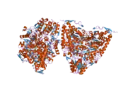 The PDHB gene encodes a precursor protein that has 359 amino acid residues and a final mature protein that has 329 amino acids, and is part of the pyruvate dehydrogenase multienzyme complex.[7] Two of the mature PDHB proteins come together with two PDHA proteins to form a heterotetrameric E1 subunit. Crystal Structures allowed for a model in which the enzyme undergoes a 2-A shuttle-like motion of its heterodimers to perform the catalysis.[10] Specifically, the catalytic residue has been identified on the PDHB subunit, the 89th residue, which is a glutamate.[11] In forming the entire PDH complex, the 289th beta residue, aspartic acid, interacts with the 276th residue of the E2 complex, a lysine.[12] The entire human complex is 9.5 MDa in size, and has been described as 60-meric, meaning there are over 60 components that are assembled to make the entire complex. These subunits are conserved across many species, as the function of this complex is essential for the generation of ATP for all eukaryotes.[13] Each component is responsible for the catalysis of one step in this pathway; this complex exists for the purpose of channeling the intermediates of each reaction to the next enzyme, thus greatly increasing the rate of reaction.[14]