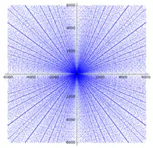Each of these points forms a radiating line in the scatter plot. Other small Pythagorean triples such as (6, 8, 10) are not listed because they are not primitive; for instance (6, 8, 10) is a multiple of (3, 4, 5).