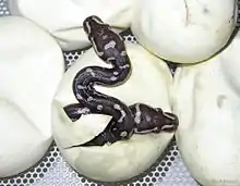 Python anchietae exhibits similar temperament to its closest cousin, the ball python. It hisses, but this is mostly bluff.[3] Diet consists of small mammals and birds.[3] P. anchietae is oviparous, with small clutches of four to five eggs being produced at a time. It is not known whether the females "incubate" their eggs as is typical for the members of this family. Hatchlings are 43–46 cm (17-18 inches) in length.[3]