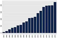 Currently, there are thousands of Q-Chem licenses in use, and Q-Chem's user base is expanding, as illustrated by citation records for releases 2.0, 3.0, and 4.0, which reached 400 per year in 2016 (see Figure 2).[8]