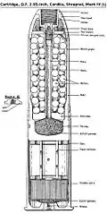 The British "Treatise on Ammunition" of 1915 stated that available rounds were Shrapnel (203 bullets), Case shot (330 bullets), Star shell and the Double common shell of 18 lb (exploding charge of 14 oz "P" mixture – gunpowder).[13]
