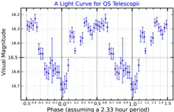 QS Telescopii is a faint, well-studied[4] binary star system in the southern constellation Telescopium.[7] It is composed of a white dwarf and main sequence donor star, locked into a close, circular orbit facing one another. Known as polars, material from the donor star does not form an accretion disk around the white dwarf, but rather streams directly onto it.[6] This is due to the presence of the white dwarf's strong magnetic field. The pair undergo frequent shifts between a high and low accretion states, and it shifts between single and double accretion poles. The main pole is partially self-eclipsing.[4]