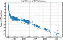 QU Vulpeculae declined from peak brightness quite rapidly, and had faded by 3 magnitudes in just 40 days, so it is classified as a "fast" nova.[5]