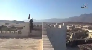 ![]() An ISS fighter hoists his group's flag over Qandala on the same building where Somali folk hero Ali Fahiye Gedi was imprisoned during the colonial era. | |||||||