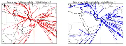 - "Flight Ban for Qatar Flights in UAE, Saudi Arabia, Bahrain, and Egypt". Flightradar24. 5 June 2017. Retrieved 5 June 2017.