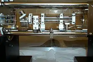 The linear ion trap uses a set of quadrupole rods to confine ions radially and a static electrical potential on-end electrodes to confine the ions axially.[11] The linear form of the trap can be used as a selective mass filter, or as an actual trap by creating a potential well for the ions along the axis of the electrodes.[12] Advantages of the linear trap design are increased ion storage capacity, faster scan times, and simplicity of construction (although quadrupole rod alignment is critical, adding a quality control constraint to their production. This constraint is additionally present in the machining requirements of the 3D trap).[13]