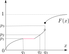 for a probability 0 < p < 1. Here we capture the fact that the quantile function returns the minimum value of x from amongst all those values whose c.d.f value exceeds p, which is equivalent to the previous probability statement in the special case that the distribution is continuous. Note that the infimum function can be replaced by the minimum function, since the distribution function is right-continuous and weakly monotonically increasing.