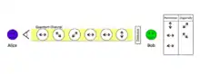 - Alice first chooses a random basis (such as diagonally) and a sequence of random qubits. Alice then encodes her chosen qubits as a sequence of photons following the chosen basis. She then sends these qubits as a train of polarized photons to Bob through the communication channel.