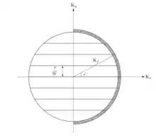 Net current through a quantum point contact, carried by the shaded region in k-space. The 1D subbands then correspond to the pairs of horizontal lines at , with n = 1, 2, . . . , N, being N the maximum number of modes allowed by the fermi energy.[8]