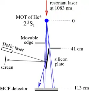 In the case with He, the additional resonant laser could be used to release the atoms and provide them an additional velocity; the delay since the release of the atoms till the registration allowed to estimate this additional velocity; roughly, , where is time delay since the release of atoms till the click at the detector. Practically, could vary from 20 to 130 m/s (45 to 291 mph; 72 to 468 km/h).[4][5][6]