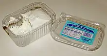 In Germany, it is continuously stirred to prevent hardening, resulting in a thick, creamy texture.[28] According to German regulations on cheese (Käseverordnung), "fresh cheeses" (Frischkäse) such as quark or cottage cheese must contain at least 73% water in the fat-free component.[21] German quark is usually sold in plastic tubs with most or all of the whey. This type of quark has the firmness of sour cream but is slightly drier, resulting in a somewhat crumbly texture (like ricotta).[28]