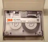 Quarter inch cartridge tape (abbreviated QIC, commonly pronounced "quick") is a magnetic tape data storage format introduced by 3M in 1972,[1] with derivatives still in use as of 2016. QIC comes in a rugged enclosed package of aluminum and plastic that holds two tape reels driven by a single belt in direct contact with the tape. The tape was originally 1⁄4 inch (6.35 mm) wide and anywhere from 300 to 1,500 feet (91 to 457 m) long. Data is written linearly along the length of the tape in one track[1] (mostly on pre-1980 equipment), or written "serpentine", one track at a time, the drive reversing direction at the end of the tape, and each track's data written in the opposite direction to its neighbor. Since its introduction, it has been widely used, and many variations exist. There is a QIC trade association that publishes QIC standards which include interfaces and logical formats. To a very large extent it was the efficiency and openness of this organization which encouraged hardware and software developers to use this type of drive and media.