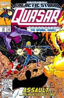 Quasar (Wendell Elvis Vaughn) is a fictional superhero appearing in American comic books published by Marvel Comics. He is one of Marvel's cosmic heroes, a character whose adventures frequently take him into outer space or other dimensions. However, Quasar deviates from the archetype of the noble, dauntless alien set by such Silver Age cosmic heroes as the Silver Surfer, Adam Warlock and Captain Marvel (Mar-Vell) in that he is an everyman. He starred in an eponymous monthly ongoing series written by Mark Gruenwald that ran for sixty issues beginning in 1989 and has served as a member of The Avengers. In 2012, Quasar was ranked 36th in IGN's list of "The Top 50 Avengers".[1]