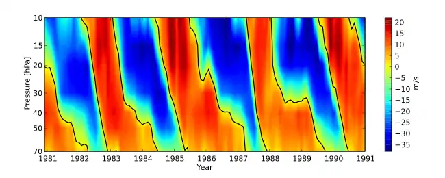 The quasi-biennial oscillation (QBO) is a quasiperiodic oscillation of the equatorial zonal wind between easterlies and westerlies in the tropical stratosphere with a mean period of 28 to 29 months. The alternating wind regimes develop at the top of the lower stratosphere and propagate downwards at about 1 km (0.6 mi) per month until they are dissipated at the tropical tropopause. Downward motion of the easterlies is usually more irregular than that of the westerlies. The amplitude of the easterly phase is about twice as strong as that of the westerly phase. At the top of the vertical QBO domain, easterlies dominate, while at the bottom, westerlies are more likely to be found. At the 30mb level, with regards to monthly mean zonal winds, the strongest recorded easterly was 29.55 m/s in November 2005, while the strongest recorded westerly was only 15.62 m/s in June 1995.