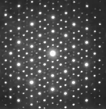 Shechtman first observed ten-fold electron diffraction patterns in 1982, while conducting a routine study of an aluminium–manganese alloy, Al6Mn, at the US National Bureau of Standards (later NIST).[17] Shechtman related his observation to Ilan Blech, who responded that such diffractions had been seen before.[18][19] Around that time, Shechtman also related his finding to John W. Cahn of the NIST, who did not offer any explanation and challenged him to solve the observation. Shechtman quoted Cahn as saying: "Danny, this material is telling us something, and I challenge you to find out what it is".[20]
