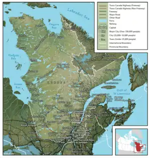Quebec (/kəˈbɛk/ kə-BEK, sometimes /kwəˈbɛk/ kwə-BEK; French: Québec [kebɛk] (listen))[8] is one of the thirteen provinces and territories of Canada. It is the largest province by area and the second-largest by population. Much of the population lives in urban areas along the St. Lawrence River, between the most populous city, Montreal, and the provincial capital, Quebec City. Quebec is the home of the Québécois nation. Located in Central Canada, the province shares land borders with Ontario to the west, Newfoundland and Labrador to the northeast, New Brunswick to the southeast, and a coastal border with Nunavut; in the south it borders Maine, New Hampshire, Vermont, and New York in the United States.