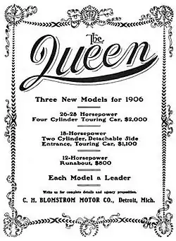 The Queen was an American automobile manufactured between 1904 and 1907 in Detroit, Michigan. Built by the C.H. Blomstrom Motor Company, Queens were chain-driven, and were one-, two-, or four-cylinder cars. The 1906 Queen was available as a 14 hp and 18 hp twin or as a 26/28 hp four.