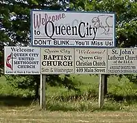 Queen City was laid out in May, 1867 by Doctor George W. Wilson and consisted of a town square surrounded by fifteen other blocks. He chose the name in the hope the town would become "the Queen of the prairies."[6] Dr. Wilson also constructed the first home in the new town, while Henry Bartlett is responsible for building the towns's first hotel. By 1888 Queen City offered a considerable business district—five general stores, two grocers, two hardware stores, two hotels, jewelry store, lumber yard, photography gallery, music store, and barber shop were just some of the businesses serving the community and surrounding farms. Being located along the railroad, it provided a fine shipping point for large numbers of railroad ties and other lumber products harvested from heavily wooded areas along the Chariton River several miles to the west. Grain, livestock and some quantities of wool were also shipped by rail from the town. Queen City's first newspaper The Transcript was established in November, 1887 by D.G. Swan.[7]