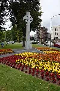 Several notable structures stand within the gardens: a Celtic Cross, symbolising the city's first European settlers and built in 2000 to mark the end of the second Christian millennium, stands at the northern end of the gardens. Statues to Queen Victoria and Donald M. Stuart, one of Dunedin's founding fathers, also stand in the gardens. The gardens are dominated, however, by the city's main war memorial, the 28-metre (92 ft) tall eight-sided column of Dunedin Cenotaph, built between 1924 and 1927.[1] A smaller memorial, listing New Zealand Victoria Cross recipients, stands next to the cenotaph. Several of the trees surrounding the perimeter of Queens Gardens were planted to remember various war anniversaries, and are accompanied by plaques commemorating these events,[2] The gardens are the scene of commemorations on ANZAC Day every April.