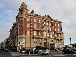 Queens Hotel is a luxury hotel in Southsea, Portsmouth, Hampshire. The current Queen's Hotel is placed on the site of Southsea house, built in 1861 by architect Augustus Livesay, which was built for Sir John and Lady Morris. In 1865, due to boom in construction and tourism, Southsea house was converted into the Queen's Hotel by William Kemp Junior. It was one of Portmouth's first hotels, and it focused on the leisure and relaxation for the upper class. At 4:20pm on 8 December 1901, a fire gutted the entire hotel, leaving only the two outer walls that face Osborne Road and Clarence Parade. On 11 December 1901, it was deemed safe to enter the site and two missing chambermaids were discovered, dead, due to being trapped by falling rubble in the basement. In early 1902, plans were submit by the hotel owner at the time, G. H. King, to rebuild the hotel to cover the original footprint. The new hotel was to be much grander and more purpose-built, to include 63 rooms for visitors, and 33 for staff. The architect of the rebuild was London based T.W. Cutler. He was to design the hotel in the Edwardian baroque style in brown terracotta. This was a rising popular style across the British Empire in 1901. Designs were grand and lavish and no expense was spared. The hotel had to be designed to make a statement. The book England describes the hotel as a "Magnificent Edwardian hotel overlooking the Common, with ornate stone-carved balconies and countless neoclassical decorative flourishes".[1] The hotel contains 74 rooms and has two bars and a restaurant.