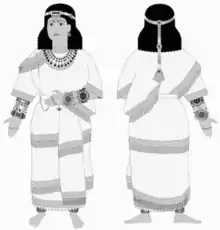 It is probable that the royal attire of the queens was inspired by Mesopotamian mythology; in the myth of Ishtar's descent into the underworld, the attire of the goddess Ishtar is described very similarly to what is known of the attire of the Neo-Assyrian queens. Given that Ishtar was partly a goddess of fertility, it is possible that the dress in turn also referenced fertility.[14] The strongest similarity to Ishtar was that the goddess in Assyrian art also wore the mural crown. This suggests that the queen may ideologically have been an image of Ishtar, and that she at times could be seen as an incarnation of the goddess.[11]