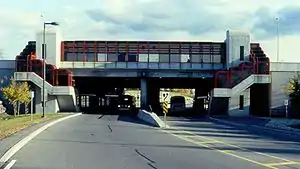 Queensway station is located around and under the Queensway along the Southwest Transitway in Ottawa, Canada. The upper platforms provide access to crosstown route 55, while the lower platforms are for Transitway routes such as routes 74 and 75 and eastbound trips of routes 61, 62, 63, and 64.