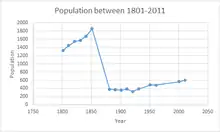 The population of Quenington in 1801 was 1,326 and steadily grew to 1,859 by 1851, but the next records in 1881 show a population drop of 1,479 to 380. This could be due to various conflicts that ensued in the three decades between the censuses, such as the Crimean War and First Boer War, or more likely a change to the parish borders. In 1911 the total population was 388 and then a decade later in 1921 there was a decrease in population to 322, which could clearly be attributed to World War I.[9]