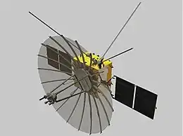 Communication with the lunar surface is accomplished in the X band, using a high-gain 4.2 metres (14 ft) deployable parabolic antenna, the largest antenna used for a deep space exploration satellite.[14] The lunar link uses PCM/PSK/PM modulation in the forward link and BPSK in the backward link. The forward link data rate of the lander and the rover is 125 bit/s. The return link data rate is up to 555 kbit/s for the lander and up to 285 kbit/s for the rover. Data transmission to the Earth operates in the S band in BPSK modulation mode, using a single mid-gain helix antenna at a data rate of up to 10 Mbit/s.[1][15]