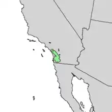 The Engelmann oak ranges from the foothills of the San Gabriel Mountains in eastern Los Angeles County through the Santa Ana Mountains of Orange County and the western foothills and mesas of the Peninsular Ranges in Riverside and San Diego counties, extending into the Sierra Juárez and Sierra de San Pedro Mártir ranges of northern Baja California. It is generally found in savannas and woodlands above the dry coastal plain, but below the 1,300 m (4,300 ft) elevation where colder winters prevail. The Engelmann oak has a smaller range than most California oaks, and suburban sprawl in the San Gabriel Valley has eliminated the oaks from most of the northern part of the range. The largest remaining stands of Engelmann oaks are on the Santa Rosa Plateau, near Murrieta in Riverside County, and on Black Mountain near Ramona in San Diego County.[1]